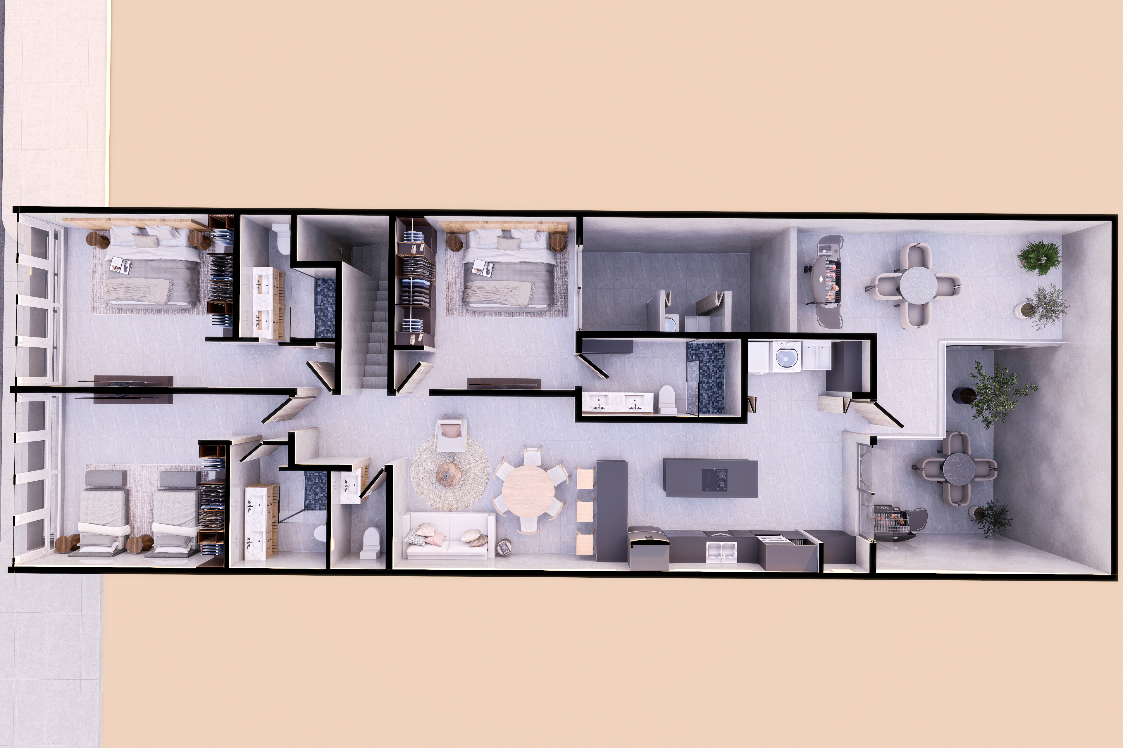 • Terraza, patio de servicio y área de lavado